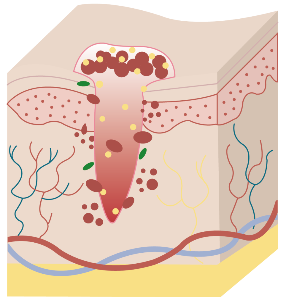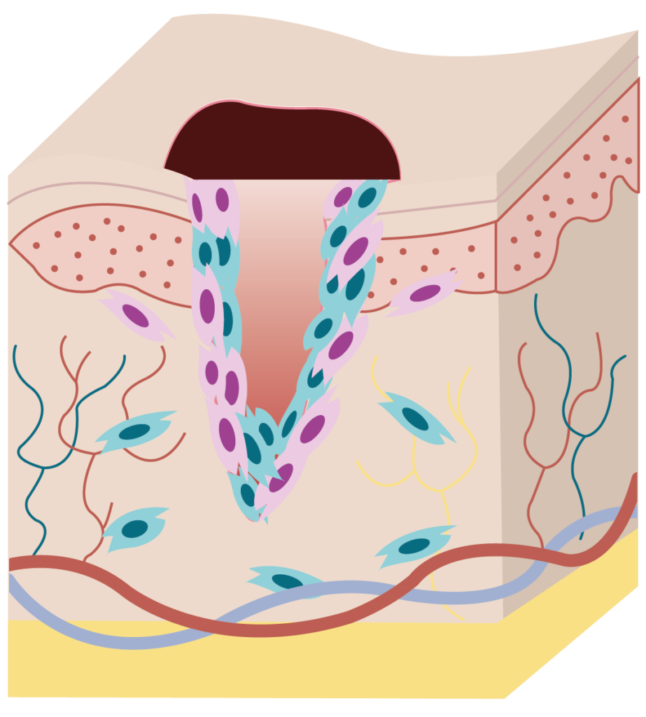 Les molécules inflammatoires et les facteurs de croissance (protéines stimulant la croissance de tissus spécifiques) sont ensuite produits pour orchestrer le processus de guérison et la réparation de la peau.